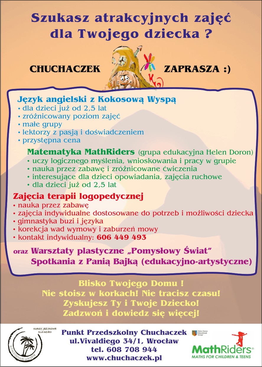 Zapewniamy naukę w małych grupach, przez zabawę,dostosowaną do wieku i poziomu wiedzy. Zajęcia odbywają się na terenie osiedla Cztery Pory Roku, w Przedszkolu CHUCHACZEK, przy ul. Vivaldiego 34/1. W ofercie m. in.: matematyka MathRiders/ metodą Helen Doron/ język angielski /Kokosowa Wyspa/ terapia i konsultacje logopedyczne i inne. Zadzwoń lub napisz i umów się na zajęcia pokazowe. 608 708 944 chuchaczek@grupawalor.pl